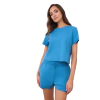 Com design moderno, o conjunto é composto por uma blusa estilo cropped e short de cós alto, ambos confeccionados em piquê, tecido leve e ideal para os dias quentes.